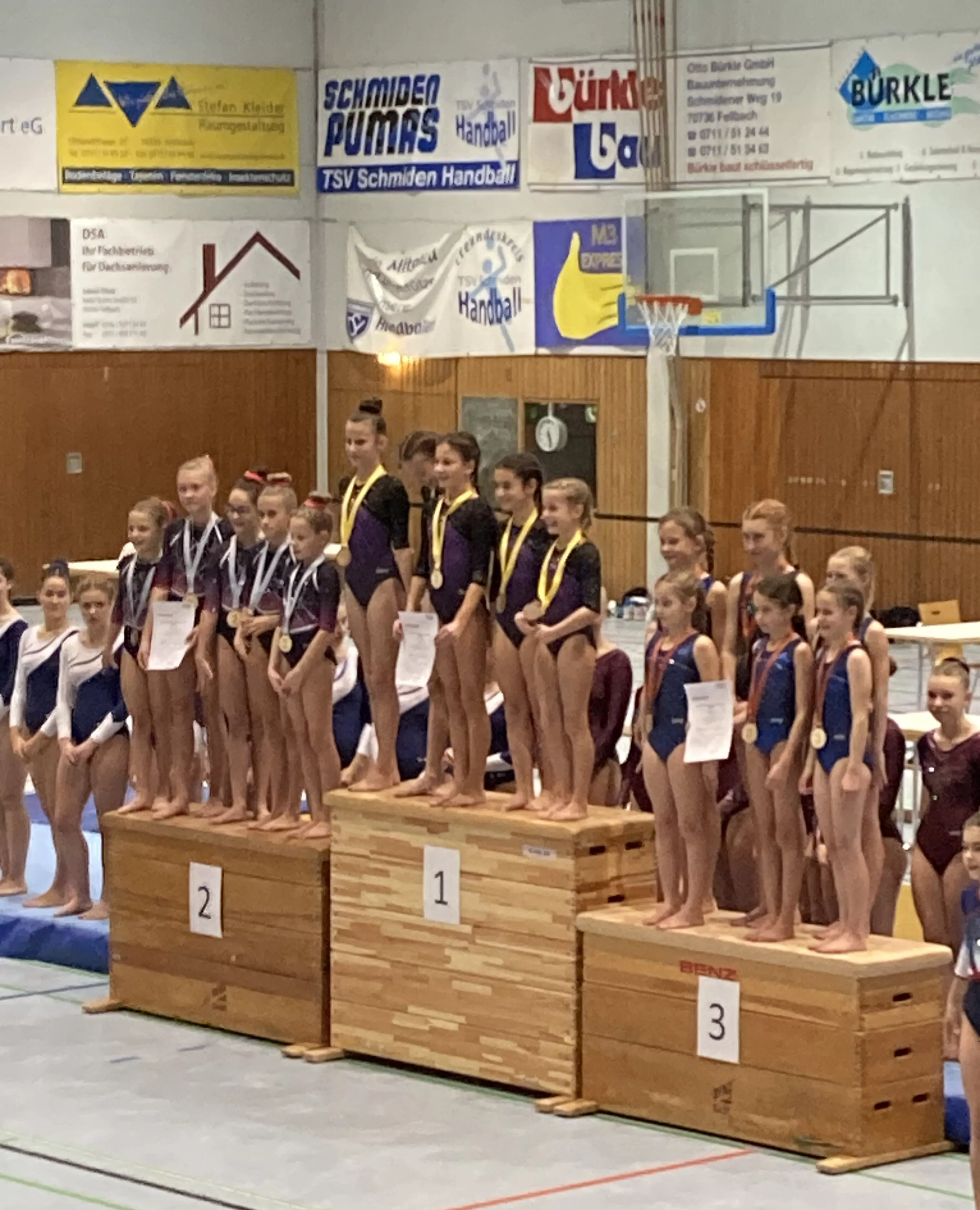 Beim Landesfinale 2023 traten in der Sporthalle in Schmiden Mayla Ginovska, Emma Lamnek, Eleyna Mößner, Eleni Triantafillidou und Marlene Tix gegen Mannschaften des MTV Stuttgart, TSV Künzelsau und nicht zuletzt den SV Hülben an. Geturnt wurde in der P6 Stufe, bei der es maximal 16 Punkte zu holen gibt. Die Übungen sind festgelegt und jede Turnerin muss die gleichen Abfolgen turnen. In eine Wertung für die Mannschaft kommen dann immer die 3 besten Ergebnisse. Los ging es mit dem Boden, eines der starken Geräte des TSV. Dies zeigte sich auch in den Wertungen, die mit 15,1 (Eleni), 14,9 (Marlene), 14,8 (Eleyna), 14,7 (Mayla) und 13,7 (Emma) auf der Habenseite verbucht werden konnten. Der Start war geglückt als 6. beste Mannschaft an dem Gerät, Elemente wie Bogengang oder Flugrolle schön geturnt. Diese Punkte gaben Sicherheit gleich beim Beginn des Wettkampfs.