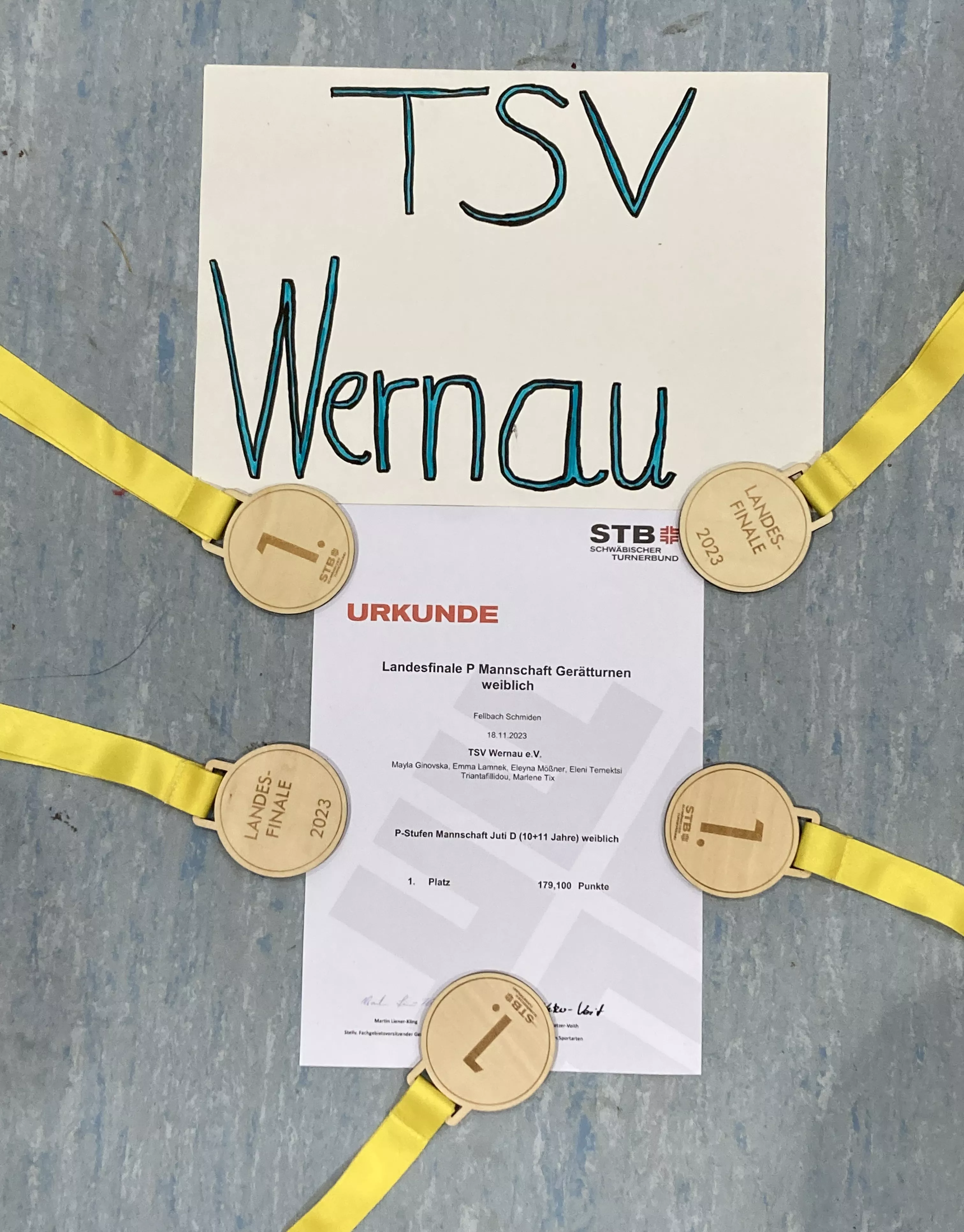 Die Spannung bei den mitgereisten Mamas und Papas war groß, denn man hatte zwar die eigenen Wertungen mitbekommen, die Schätzungen über die Platzierung ermöglichten, jedoch alle Geräte und alle Mannschaften gleichzeitig zu beobachten ist nicht möglich. Dennoch hofften alle ob der guten eigenen Ergebnisse auf eine Platzierung 5 oder 6 oder 7, was sensationell wäre; was würde es aber am Ende sein? Dann die Siegerehrung: 7.Platz…..Böckingen, 6.Platz…..MTV Stuttgart traditionell immer ganz vorn dabei, erstaunt schauten sich die Wernauer Fans an, 5.Platz……Balingen, 4.Platz…..Öhringen! Ein Platz auf dem Treppchen war sicher, die Mädels freuten sich schon riesig. Dann der 3. Platz……TSV…..Künzelsau! Die Spannung war nicht mehr zu ertragen. Wernau oder Hülben……2.Platz…..SV Hülben. Nun gabs kein Halten mehr. Die Fans jubelten, die Mädels sprangen aufgeregt auf das Siegertreppchen; der TSV Wernau war 1. Sieger beim Landesfinale 2023!!!!