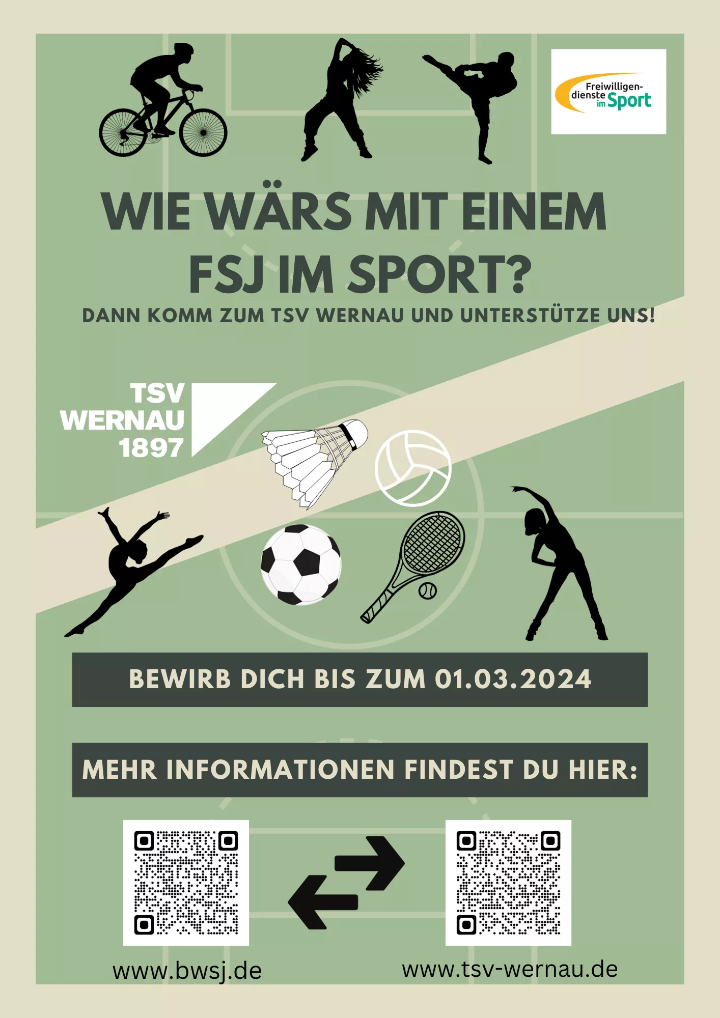 Wir, der TSV Wernau e. V. (anerkannte Einsatzstelle für die Freiwilligendienste im Sport), bieten dir die Möglichkeit, ein Freiwilliges Soziales Jahr (FSJ) „Sport und Schule“ zu absolvieren.